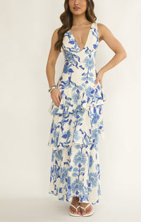 Make a statement in this stunning fitted bodice, tired frill dress in a beautiful unique blue floral printed voile fabric.