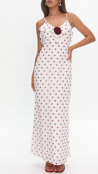 Effortlessly feminine and endlessly elegant, this polka dot maxi dress is designed to turn heads. Crafted in a soft ivory base with classic wine-toned polka dots, it features a flattering slim silhouette that skims the body beautifully. The delicate ruffle neckline is finished with a statement rose applique at the centre front, adding a romantic touch, while adjustable spaghetti straps ensure a perfect fit.