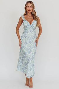 Our best selling dress, returns in a blue and turquoise floral printed chiffon fabric! Such a romantic, flattering and elegant maxi dress that can easily be dressed up or down for your next event!